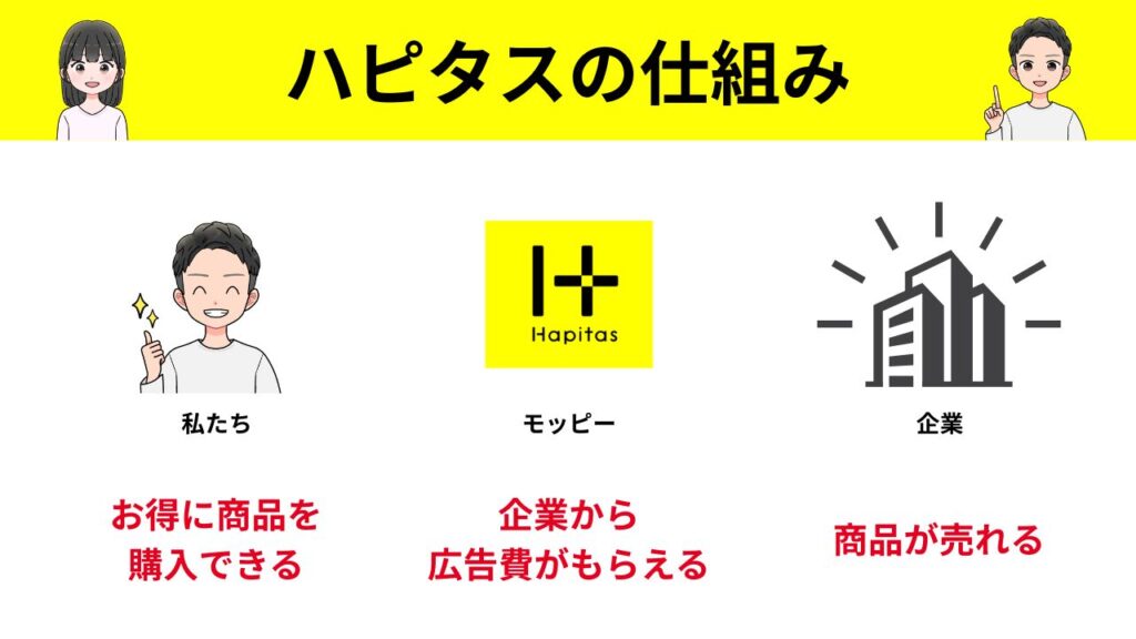 ハピタスは経由するとお得に商品が購入できるポイントサイトです。怪しいと感じる方も多いですが、実は企業やモッピーにもメリットがある三方良しの仕組みになっています。正直、私たちユーザーは使わない理由はありません。公式サイトから購入や口座開設しても1円ももらえませんが、ポイントサイト経由なら数万円もらえることも。